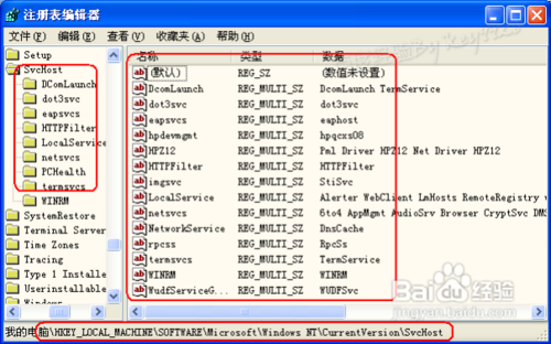 知已知彼。Svchost.exe的键值是在“HKEY_LOCAL_MACHINESoftwareMicrosoftWindowsNTCurrentVersionSvchost”,每个键值表示一个独立的Svchost.exe组。所以可以根据这个位置来判断是否中毒: