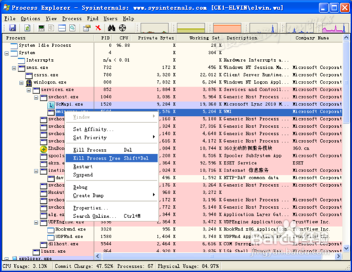 用tasklist命令查看的不够详细,你还可以用第三方进展查看软件,或微软内部提供的SysinternalsSuite包中的进procexp.exe进程查看程序来观察判断,对于不确定的进程建议用“Kill Process Tree”杀掉: