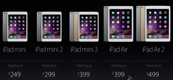 其中iPad Air 2最低售价3588元,而iPad mini 3最低售价2888元,两者价格700元,价格相差并不是很大。
