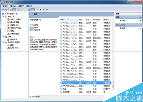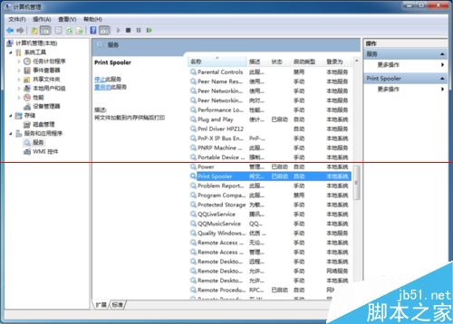 6、右击电脑桌面计算机图标,选择管理,重启 【服务】中的:Print Spooler、Server、Workstation等服务,如下图