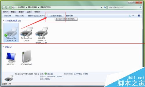 8、如果上述方法仍不能打印,则右击打印机图标,选择出现的【打印服务器属性】,如下图