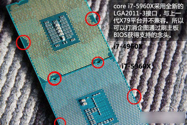 i7-5960X采用全新的LGA2011-3接口,与上一代X79平台不兼容,只能搭载Intel新一代X99主板。
