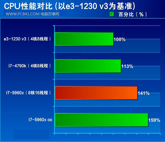 评测的最终结果是,i7-5960x处理器在主频3GHz的性能要比3.3GHz的E3-1230 v3整体性能提高41%,比4GHz的i7-4790k高28%,性能提升非常明显,不过性能大幅提升的同时,价格也显得非常昂贵,其售价在7999元左右,是目前售价最高的Intel桌面CPU。