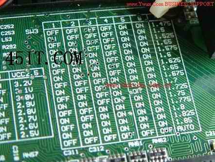 一般而言,大部分高品质主板上一般都采用纯跳线方式进行超频,比如可以通过JCLK1跳线设定CPU外频情况(如图1)。设置标准可以参考主板PCB上的印刷表格说明,当然也可以查阅主板说明书。对于一些主板,还可能具有DIP超频开关,以磐英EPOX EP-4SDA 主板为例说,在超频之前,我们需要打开机箱,然后从主板PCB上找到一个印刷表格(如图2),上面会有关于CPU条线设置的说明,这里会有CPU电压的设置说明,然后找到对应的DIP开关(如图3),根据你的CPU情况参照说明进行设置即可。