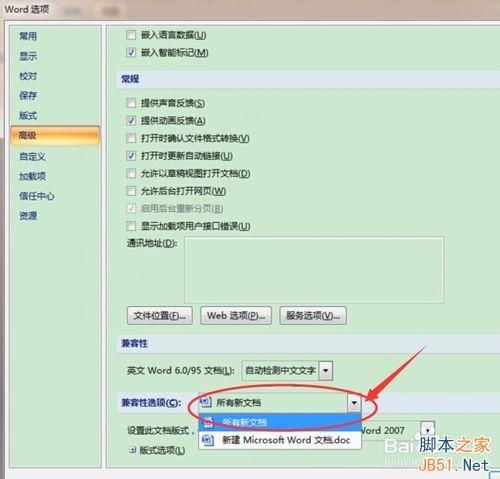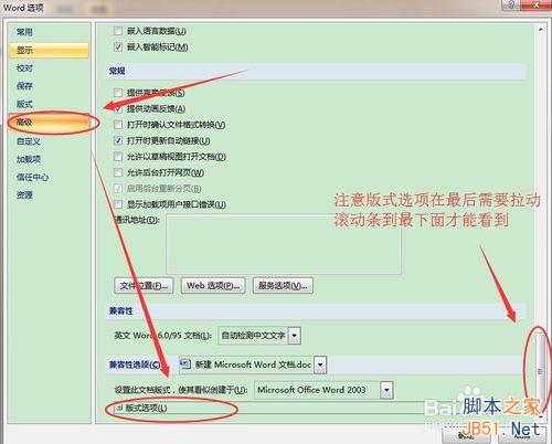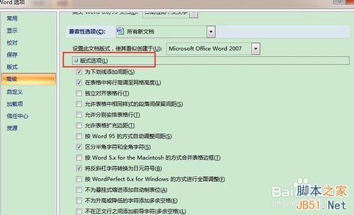 3、将兼容性选项 设置为所有文档 ,这样以后所有文档都生效。 并展开"版式选项",