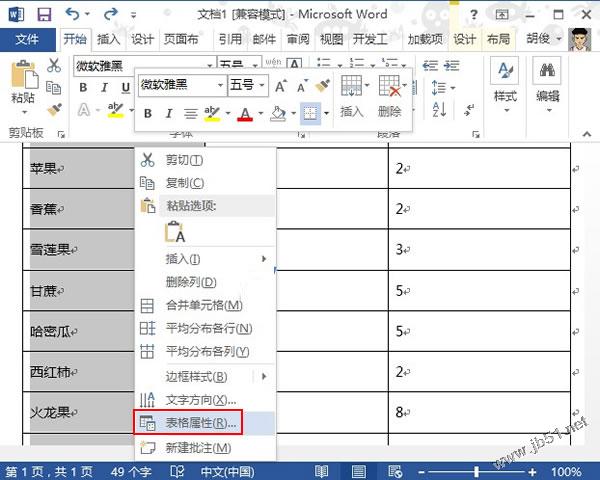 ①鼠标右键单击表格,从弹出的菜单中选择表格属性。