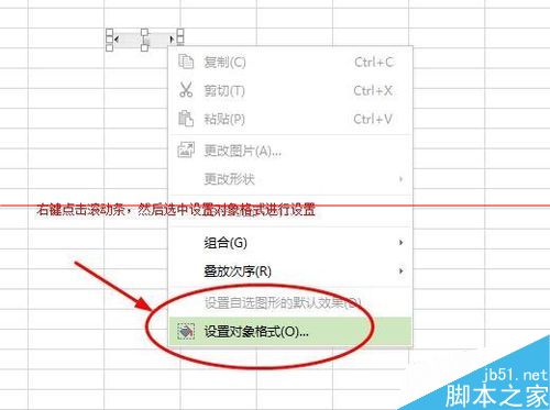 5、滚动条添加好了,下一步就是进行设置。右键点击滚动条,然后再弹出的对话框选择设置对象格式进行设置。