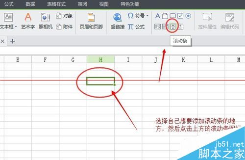 3、然后选中自己想要加滚动条的单元格,再在上方找到滚动条图标,点击滚动条图标。