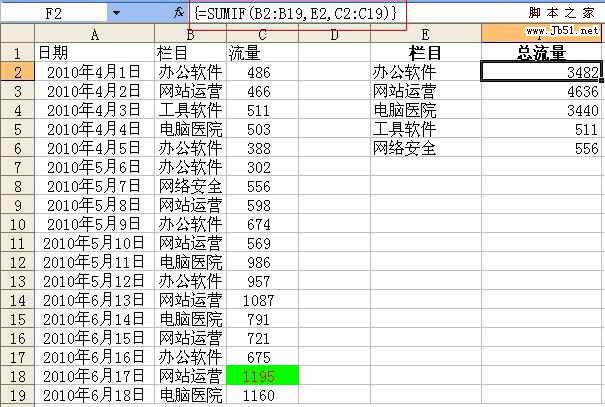 选中F2单元格,输入公式:=SUMIF(B2:B19,E2,C2:C19),输入公式完成后,按键盘上ctrl+shift+enter组合键(必须按此ctrl+shift+enter组合键数组公式才能得到正确结果),即可统计出办公软件栏目的总流量。