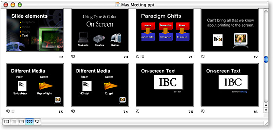对 于要点来说,使用简单的从左至右显示(通过动画菜单)就行了,但移动(Move)或漂动(Fly)动画就显得过于沉闷与缓慢(然而,今天许多演示还使用这 种形式的动画)。一帧接一帧的动画很快就会让听众感到厌烦。至于幻灯片之间的过渡,只需要使用二到三种类型的过渡特效,不要在所有幻灯片之间添加特效。
