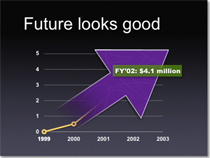 曲线图:用于说明趋势。例如,下面这幅简单的曲线图说明我们的销售在逐年增长。增长趋势良好。最后的箭头强调一个问题:我们将来的发展似乎不错。