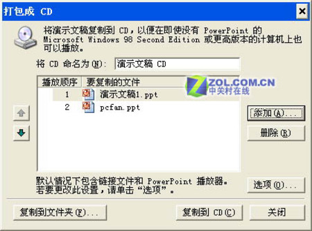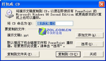 直接打包演示文稿到 CD 需要 Windows XP 或更高版本。如果是其他版本的Windows,可以先使用“打包成 CD”功能将演示文稿打包“复制到文件夹”,然后使用 CD 刻录软件将打包文 件夹中的文件该录到 CD 中。