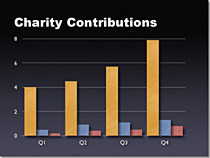 但是,表格可能缺乏视觉效果。例如,如果您希望说明您们做出的贡献显著高于其它两个部门,最好以条线图(见下图)的形式进行说明。但如果您希望弱化您们的贡献低于其它部门这一事实,用表格传达信息就可减少人们的注意力或感情色彩。