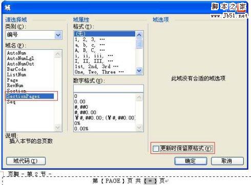 在这行代码中的“=”号后,继续插入域,这次我们插入的域是“编号”中的“SectionPages”。