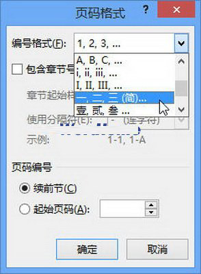 第3步,在打开的“页码格式”对话框中,单击“编号格式”下拉三角按钮。在编号格式下拉列表中选中“一、二、三(简)……”选项,并单击“确定”按钮,如图2013080218所示。