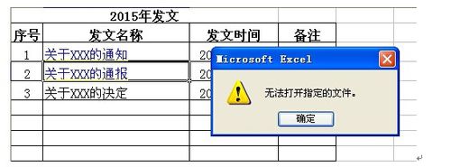 当把“2015年收发文”excel表格移到其他位置,便会出现“无法打开指定文件”的提示