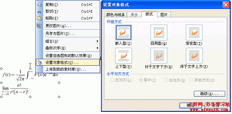 鼠标右击所选公式选择“设置对象格式”选项,选择“版式”选项卡,如图9。