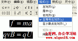 使用公式编辑器时,有时我们希望两行长度差别较大的公式能统一用公式中的某个位置(比如等号)对齐,如图6。