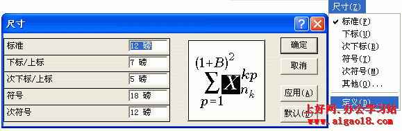 其实公式编辑器提供了更改尺寸的设置。打开公式编辑器菜单栏“尺寸”-“定义”即可更改输出公式的尺寸,如图2。