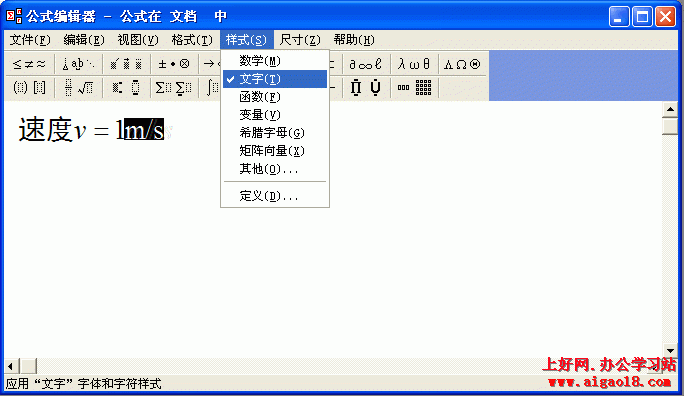 有时由于有特殊含义,需要把公式中的某些西文字符的倾斜取消,譬如物理单位就不能使用斜体,则需要选中该字符,点击“样式”-“文字”来恢复正体,如图5。