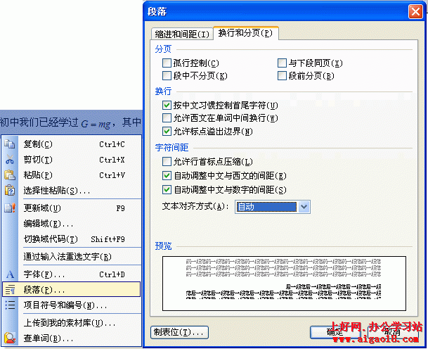 我们可以通过设置该段文字的段落格式来使公式恢复整齐。选中该段文字,鼠标右击选择“段落”选项,再选择“换行和分页选项卡”,如图11。