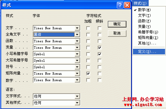 如图4,打开菜单栏“样式”-“定义”,可以通过调整来改变公式中文字的字体。