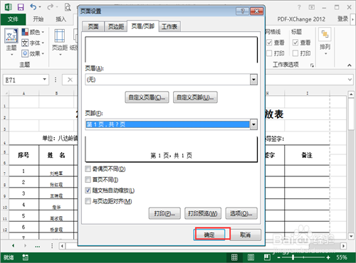 2、点击“页眉/页脚”进入设置。选择自己喜欢的页脚格式,点击“确定”。