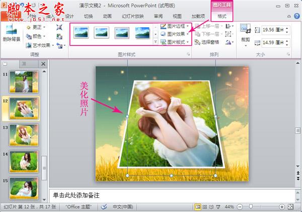 接下来就需要美化照片,单击选中照片,然后拖动照片四周的点可缩放或旋转照片,使得照片在幻灯片页面显得平衡美观,然后还可以选择“图片工具”为照片添加上边框或特效等。