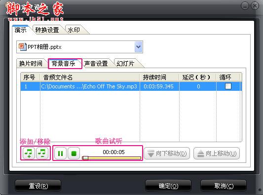 通过主界面“自定义”设置按钮,为视频相册配上一段动听的音乐,要不图片寂静无声的展示,多少失了色彩,可以选择MP3格式的音频或MP4格式的视频作为背景音乐都可以。