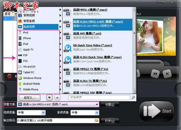 背景音乐添加完成之后,点击确定按钮回到软件主界面,此时点击预置方案进行设置视频相册的视频格式,可以直接根据播放设备选择格式,或者选择高清视频格式等。