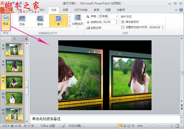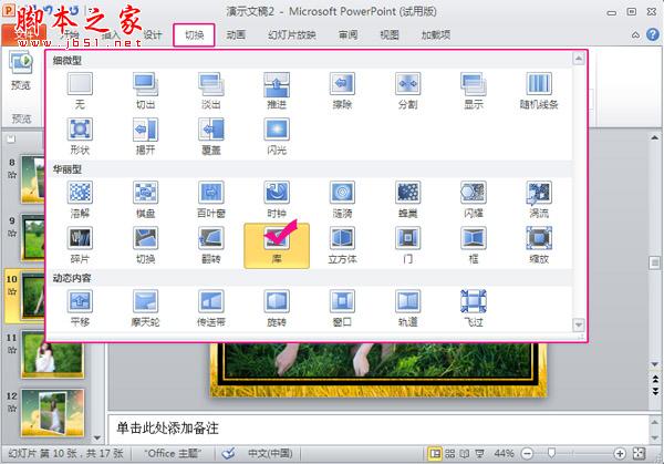 现在我们来设置照片的动画特效:小编做的这个PPT相册是每一张照片就是一张幻灯片,你也可以做成多张照片为一张幻灯片。我们利用“切换”特效来设置动画效果,依次选中每一个幻灯片,然后在“切换”中选择一种满意的“切换方案”即可,非常简单!