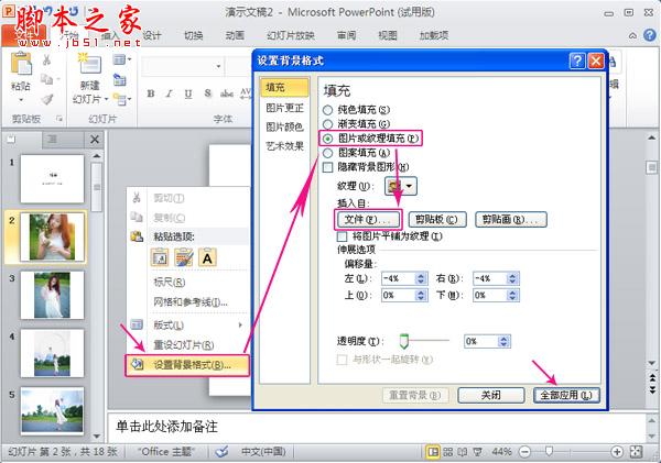 照片导入PPT空白文档之后,由于照片尺寸的不同,所以有的PPT页面会出现大片的空白,影响美观。此时我们需要为PPT相册选择一个漂亮的背景图片,可以是静态或者动态的都行。单击幻灯片页面空白处,然后选择背景格式设置,把背景图片插入PPT相册中。