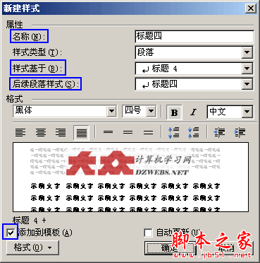 上图中,有四个地方是需要你设置的,分别是名称、样式基于(这里就选择标题4)、后续段落样式和添加到模板。