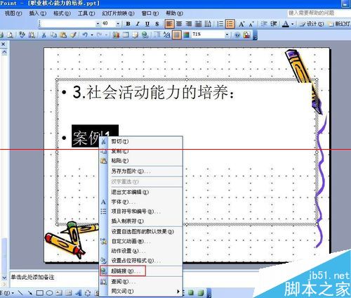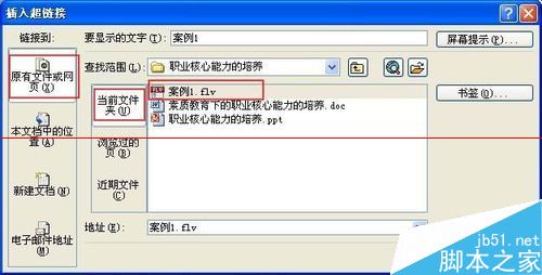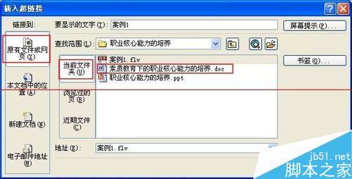 3、选中要插入视频位置的文字,然后鼠标右击,再点击“超链接”,便弹出一个“插入超链接”的窗口,然后点击“原有文件或网页”→“当前文件夹”→选中所需的视频,再点击确定,便可以看到要插入视频位置的文字下面多了一条下划线,说明已经链接成功了。