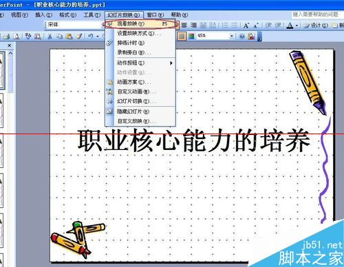 4、播放幻灯片检验。有两种播放幻灯片的方式:一是点击菜单栏“幻灯片放映”→“观看放映”,或直接点击“F5”键;二是点击幻灯片窗口右下方的杯子形状的按钮,或通过快捷键“Shift+F5”来播放。