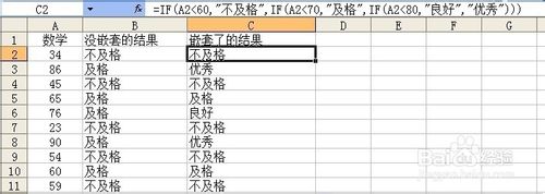 可是,你会问小编,分数不是还分及格、良好或者优秀的吗?我又该怎么判断呢?其实很简单,就是你连续使用IF就好了,术语上叫“IF函数嵌套”。比如我想60-70显示及格,70-80显示良好,80分以上显示优秀