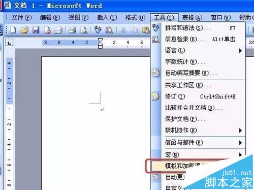 1、打开损坏的文档;单击Word菜单栏的“工具”,然后选择“模板和加载项”。