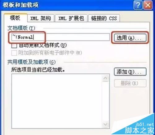 2、如果“文档模板”框列出的模板不是Normal.dot模板,则单击“选用”。