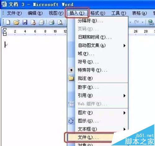 2、选择“空白文档”;在“插入”菜单上,单击“文件”。