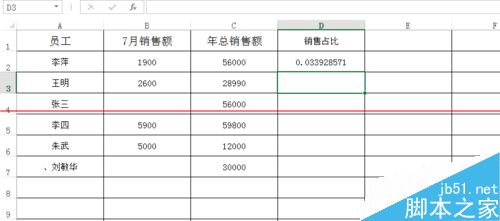 5、输入完整的函数 =IF(OR(B2="",C2=""),"",B2/C2) ,如果月销售或年销售为空时,则在占比列显示空,否则就计算出7月的销售占比。