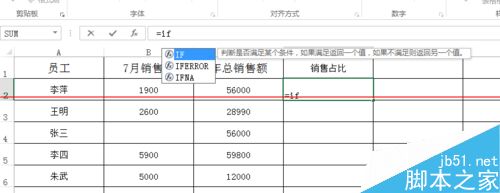 2、将光标定位在结果输出的单元格上,在编辑栏中输入 =if,会提示if函数的含义,如果符合条件会返回一个值,若不符合则返回另一个值。此处的实例想要7月有销售额时输出占比,若没有则返回空值。