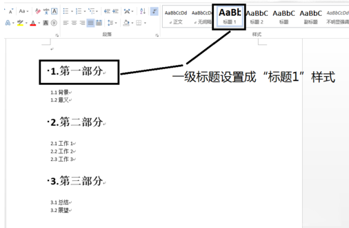 2.选中一级标题,点击样式里的“标题1”,依次将所有的一级标题进行设置,如下图所示。