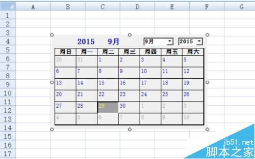 6、拖动鼠标后完成后,在我们的表格窗口中会发现日历已经在里表格中展示出来了。这个就是我们要在excel表格中插入日历的效果。如图所示;