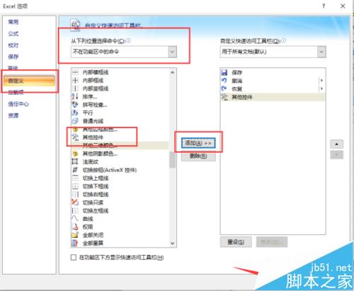 2、在弹出的”Excel窗口界面中,依次选择左侧窗口的”自定义选项,接着再点击中间窗口的”从下列位置选择命令(C)的下拉按钮,选择”不在功能区的命令,找到窗口中的”其他控件选中它,然后点击【添加】,最后点击【确定】按钮。如图所示;