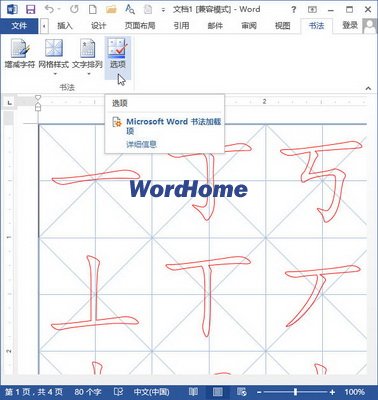第1步,在书法字帖编辑状态下,单击“书法”功能区的“选项”按钮,如图2013080418所示。