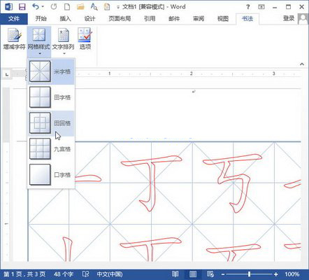 Word2013书法字帖提供了田字格、田回格、九宫格、米字格、口字格等网格样式,用户可以根据自己的需要设置字帖的网格样式。在“书法”功能区中单击“网格样式”按钮,在打开的网格列表中单击需要的网格样式即可,如图2013080421所示。