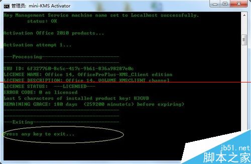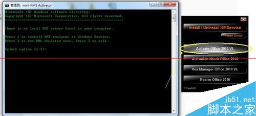 第三步,选择框框第二个:Activate Office 2010VL,运行Activate,进行激活。在命令提示符里面提示的:elect option [1-3]:后面输入1就可以了。等到出现Press any key to exit...就可以全部关掉了。