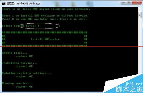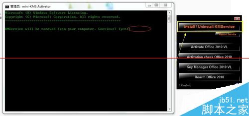 打开激活软件之后会 出现一个框框。点击第一个:Install/Unimstall KMService,打开之后出现下图1所示。这个步骤是要安装“KMService”。在命令提示符里面输入“y”即可,等到出现Press any key to exit...就可以关掉命令提示符了,注意右边的框框不需要关掉。