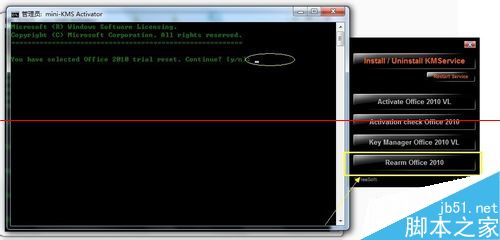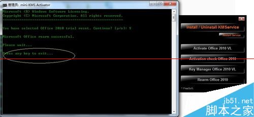 第二步,选择框框里面的最后一个Rearm Office 2010,该步骤的意思是要重置“Rearm”,接下来的步骤同第一步:在命令提示符里面输入“y”即可,等到出现Press any key to exit...就可以关掉命令提示符了,也要注意,右边的框框还不需要关掉。