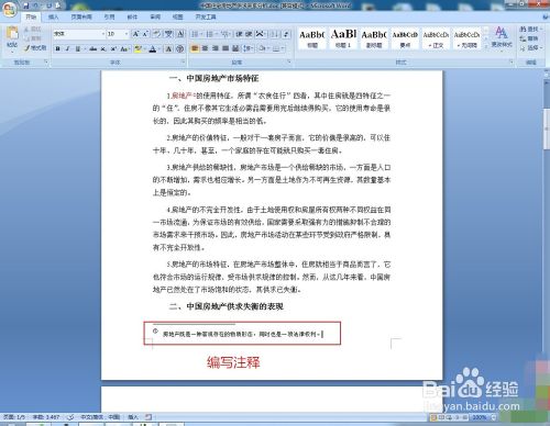 4、然后光标自动跳到该页的尾端,现在只需把“房地产”我们需要添加的注释写入就可以了。这个注释的字体大小和标号大小是可以调整的。
